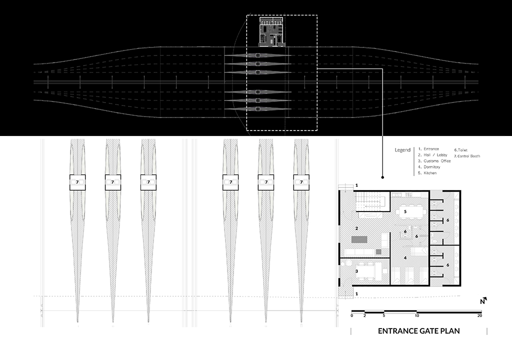 Functional: The design of the gateway is based on a vehicular and pedestrian access system that ensures smooth traffic flow while maintaining passenger safety. A wide canopy is provided for temporary stops and entry control without causing traffic congestion. Attention is given to auxiliary services such as informational signage, lighting, and urban wayfinding markers. The structure’s legibility as a city landmark is emphasized, conveying the identity of the entrance alongside its functional role.