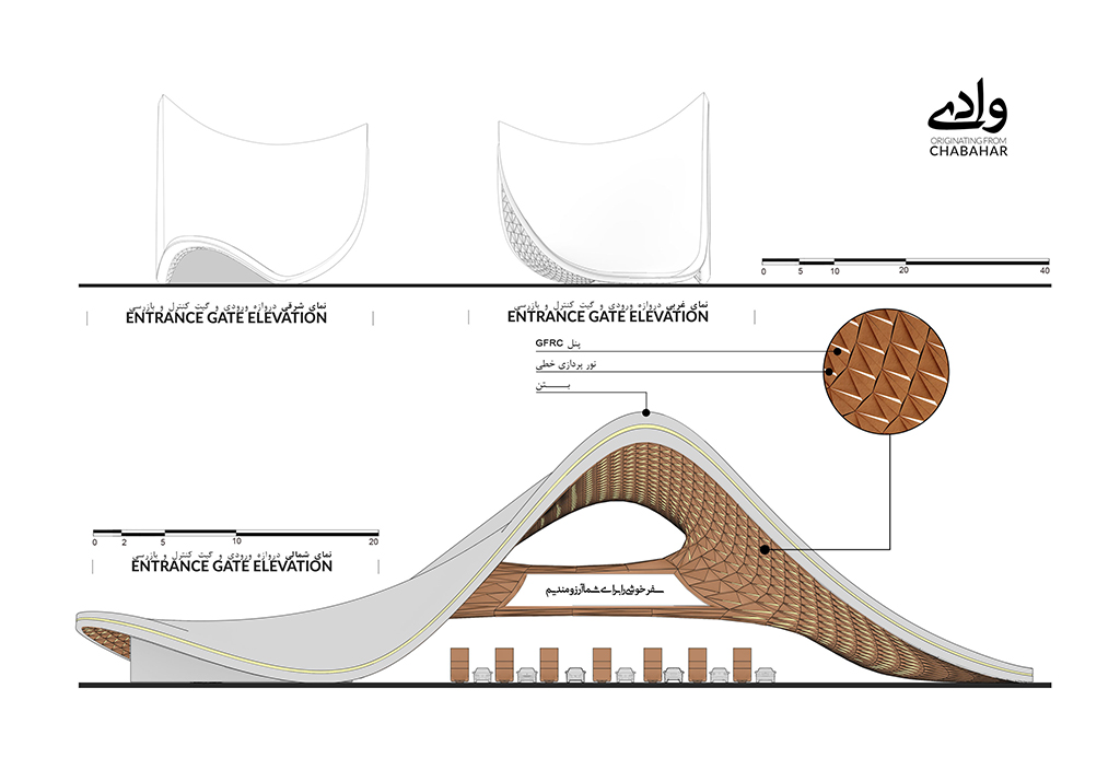 چابهار، سرزمین تلاقی دریا و کویر، همواره دروازهای رو به جهان بوده است؛ نقطهای که فرهنگ، تجارت و تمدن در آن به هم گره خوردهاند و نسیم اقیانوس، بوی تاریخ کهن ایران را با خود به همراه دارد. در طراحی دروازه ورودی این شهر، ما به سراغ کهنترین نماد معماری بومی آن رفتهایم، کپر؛ فرمی که قرنها مأوای مردم این سرزمین بوده و در عین سادگی، مظهر پیوند انسان با طبیعت و اقلیم است. کپر، همانند یک دروازه، سایه و پوشش میآفریند، مرزی میان بیرون و درون ترسیم میکند و بهعنوان نشانی از اجتماع و پیوند عمل میکند.