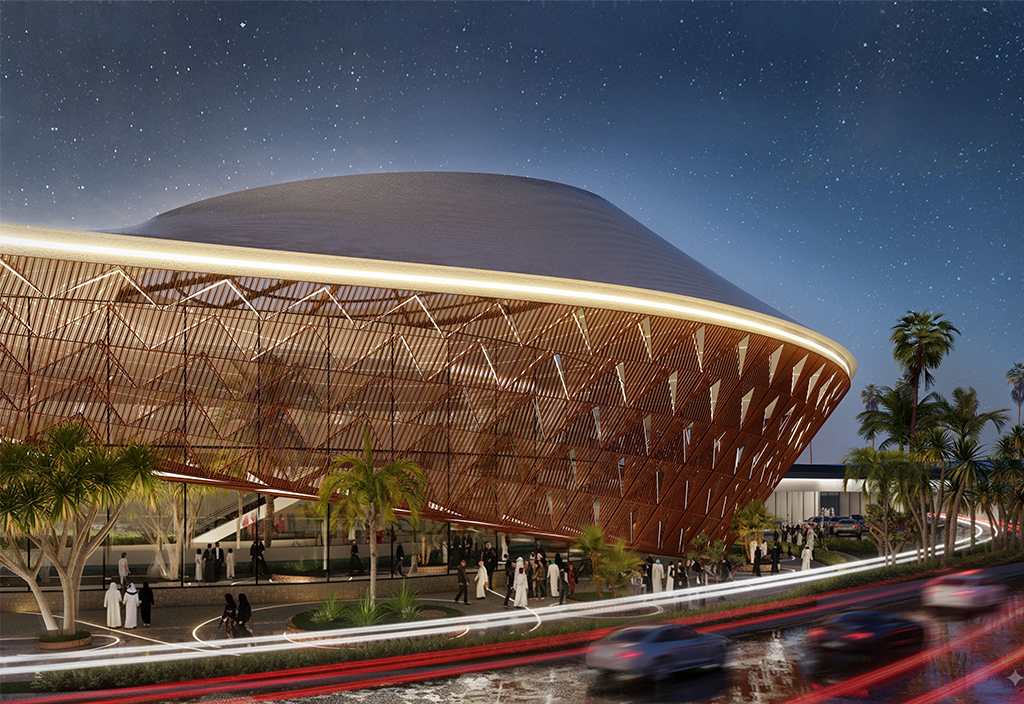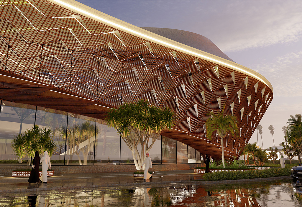 · پوسته و مصالح: نما و حجم کلی بنا، با انحناها و برآمدگیهای نرم، مستقیماً از خطوط روان تپههای ماسهای اقتباس شده است. پالت مصالح متشکل از خاکهای بومی، کاهگل معاصر و سنگهای محلی است تا ساختمان نه تنها در رنگ، بلکه در بافت نیز با زمین ادغام شود و یادآور استحکام و اصالت معماری بومی باشد.