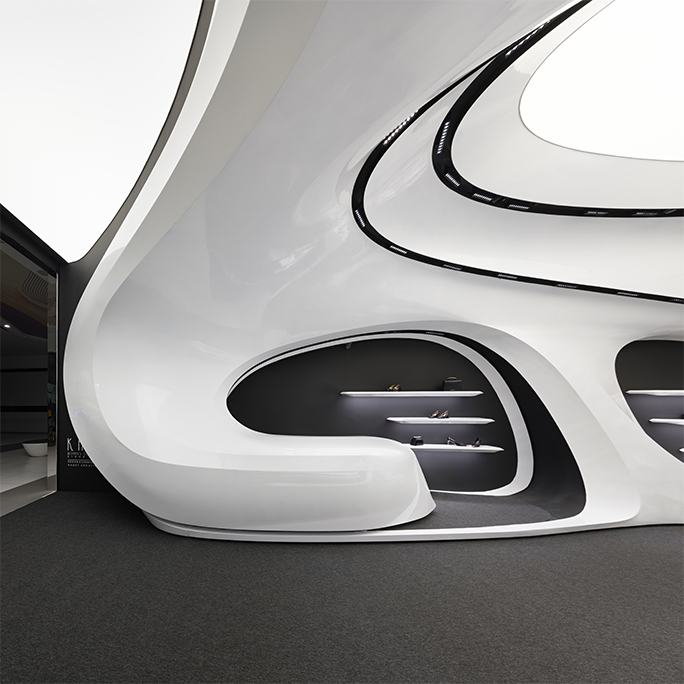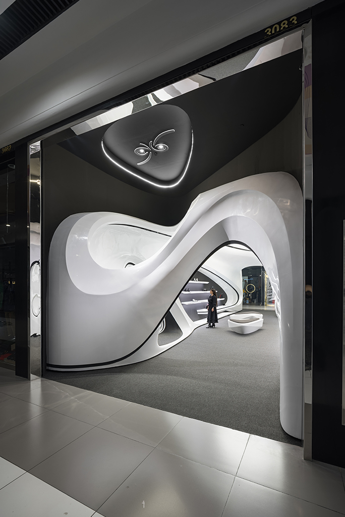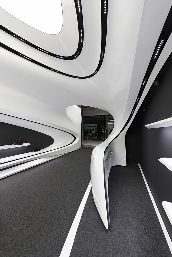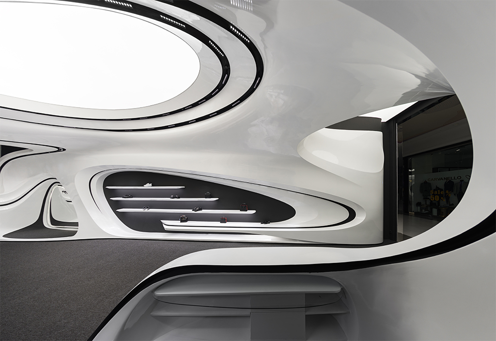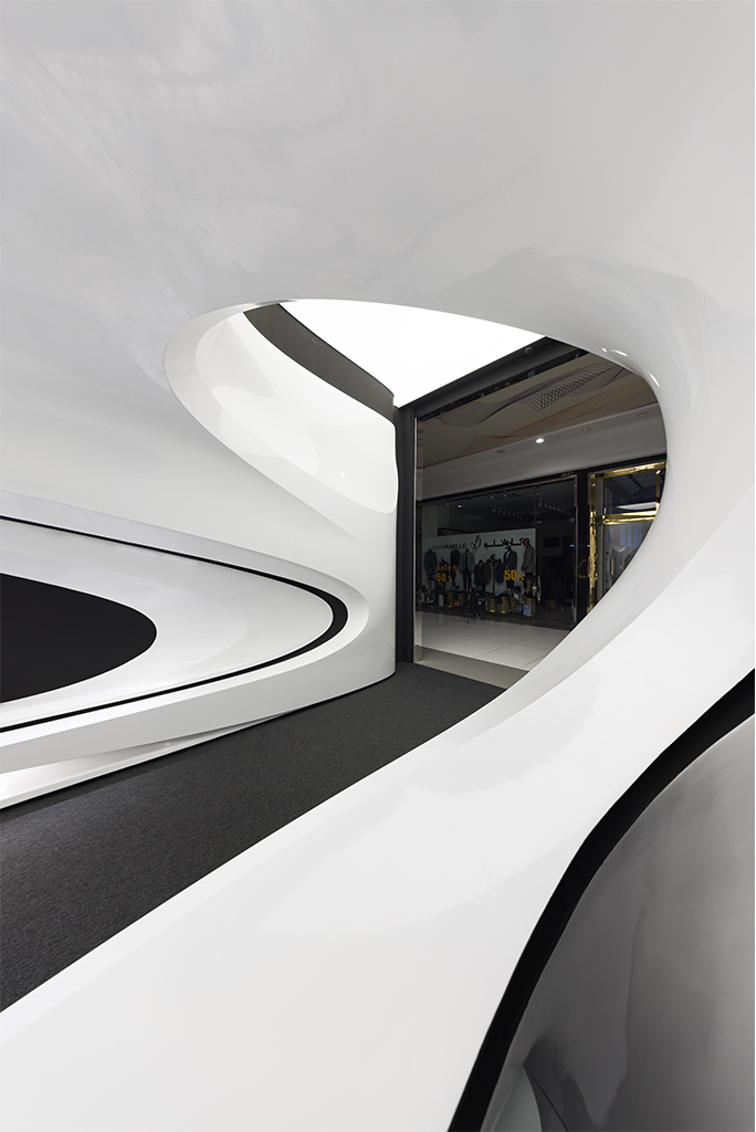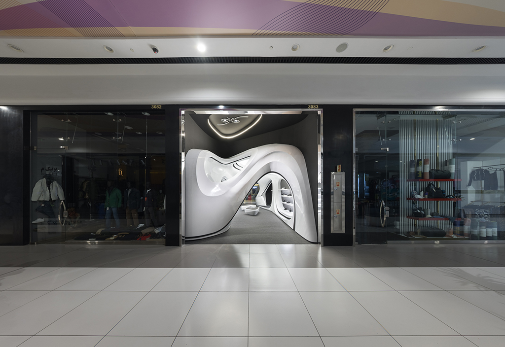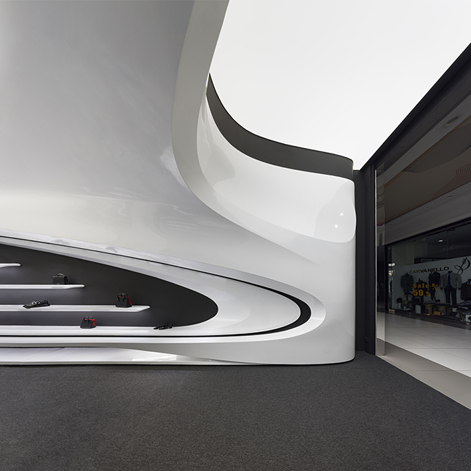 اما نکته ای که بسیار مهمتر بود نحوه برخورد با این مسیر جدید (بستر پروژه) بود که فرآیند طراحی را بسیار تحت تأثیر قرار میداد. استراتژی اصلی ما برای طراحی فضا این بود که پروژه به جای نگاهی فروشگاهی در قامت یک پاویون در میانه فضای زیست تجاری ظاهر شود و ضمن برداشتن جدا کننده ورودی، مرز قطعی با بستر خود ایجاد نکند. در واقع مخاطب را به جای مواجهه با یک فروشگاه، با یک مفصل ارتباطی آزاد در قامت پیوستاری سیال رو به رو کند.