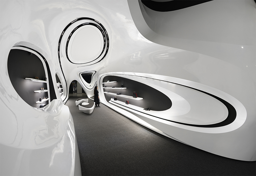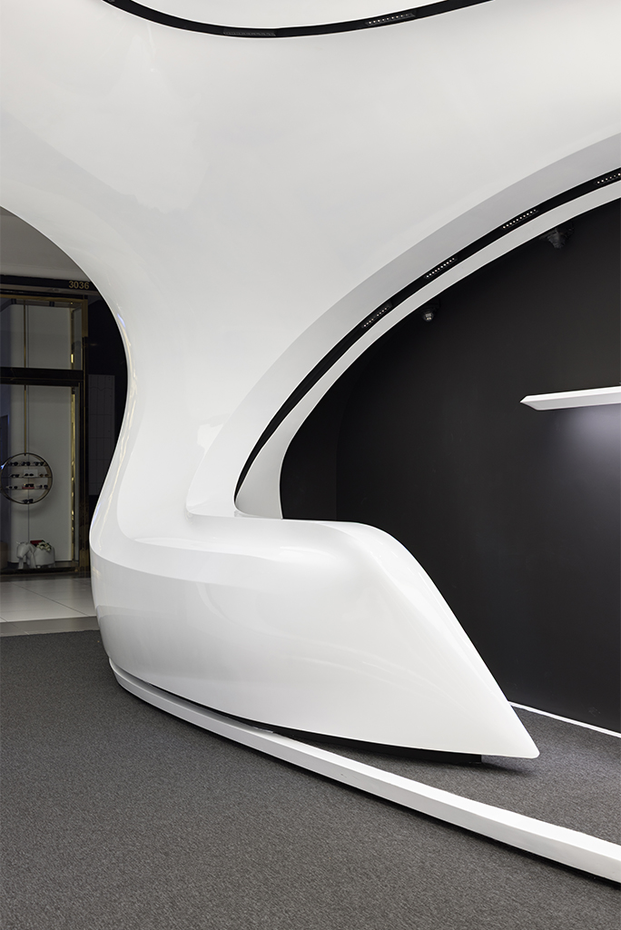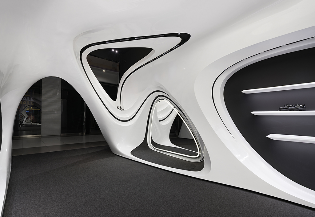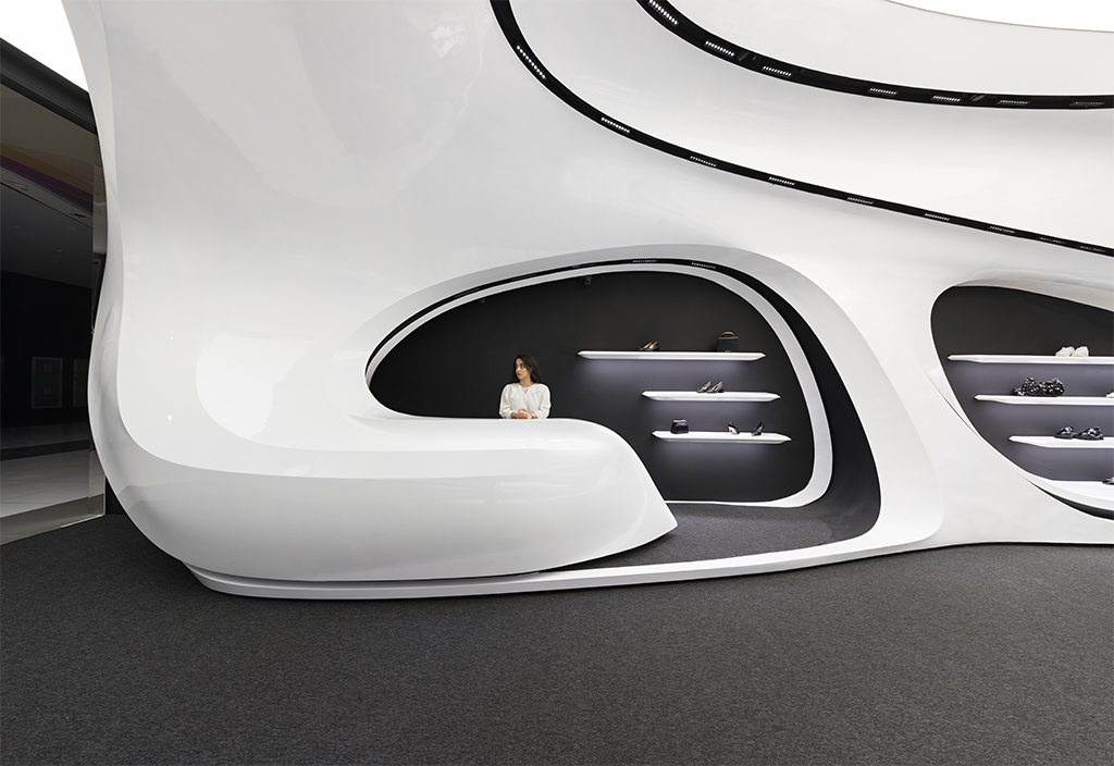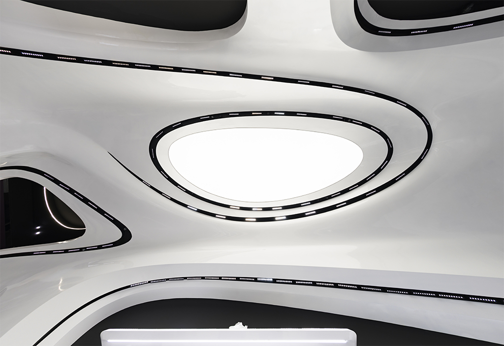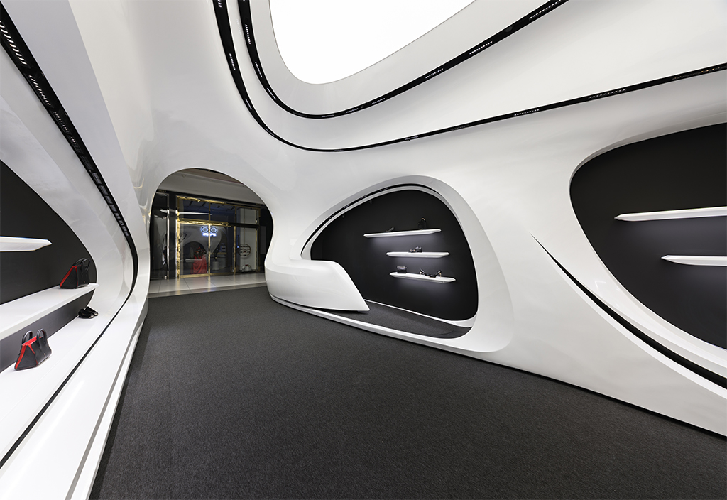 اما نکته ای که بسیار مهمتر بود نحوه برخورد با این مسیر جدید (بستر پروژه) بود که فرآیند طراحی را بسیار تحت تأثیر قرار میداد. استراتژی اصلی ما برای طراحی فضا این بود که پروژه به جای نگاهی فروشگاهی در قامت یک پاویون در میانه فضای زیست تجاری ظاهر شود و ضمن برداشتن جدا کننده ورودی، مرز قطعی با بستر خود ایجاد نکند. در واقع مخاطب را به جای مواجهه با یک فروشگاه، با یک مفصل ارتباطی آزاد در قامت پیوستاری سیال رو به رو کند.