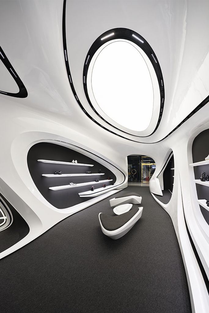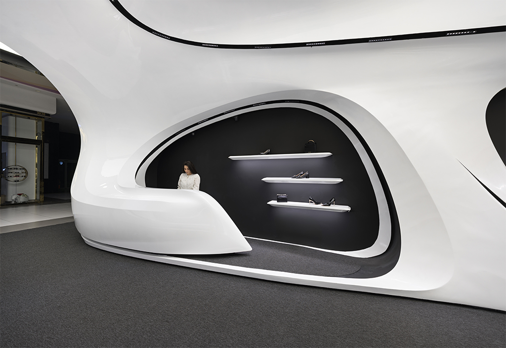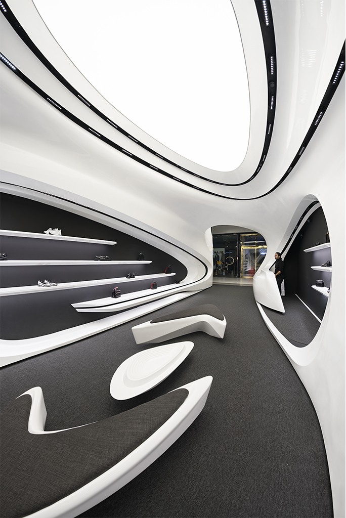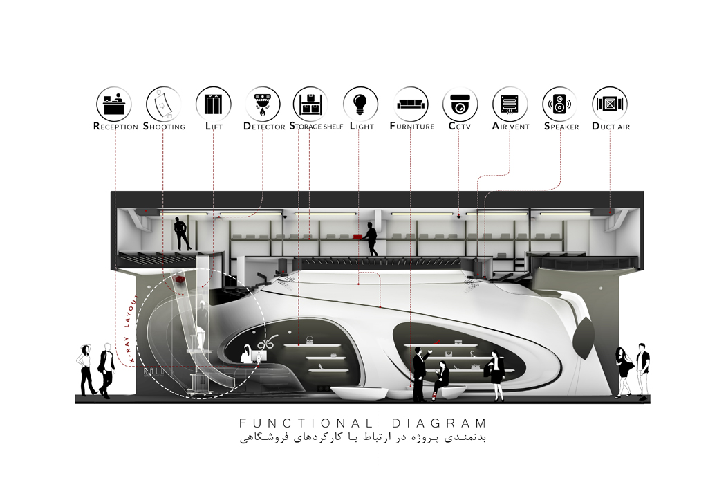 به لطف ارتفاع بلند فضا و آناتومی منعطف فضای فروشگاهی، سازماندهی دوسطحی در فضا شکل گرفت. این نوع برخورد با ارتفاع این امکان را میداد که علاوه بر فضای همکف که به فروش و نمایش محصولات و حضور مخاطبین اختصاص داشت، در بخش بالای سقف نیز فضای مناسبی برای انبارش کالا و آماده سازی برای تحویل به مشتریان ایجاد شود. ایجاد دسترسی به فضای انبار و طراحی شوتینگ کالا که همگن با عناصر بصری طرح باشد از جمله موضوعات چالش برانگیز و از اهداف عملکردی در فرآیند طراحی بود. مبلمان میانی به صورت 360 درجه طراحی شده تا از هر سو قابل استفاده باشند. این مبلمان علاوه بر اهداف عملکردی و ایجاد حس احترام در جهت دادن به فضاهای گردش مشتری نیز نقش بسزایی دارد.