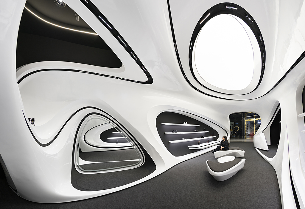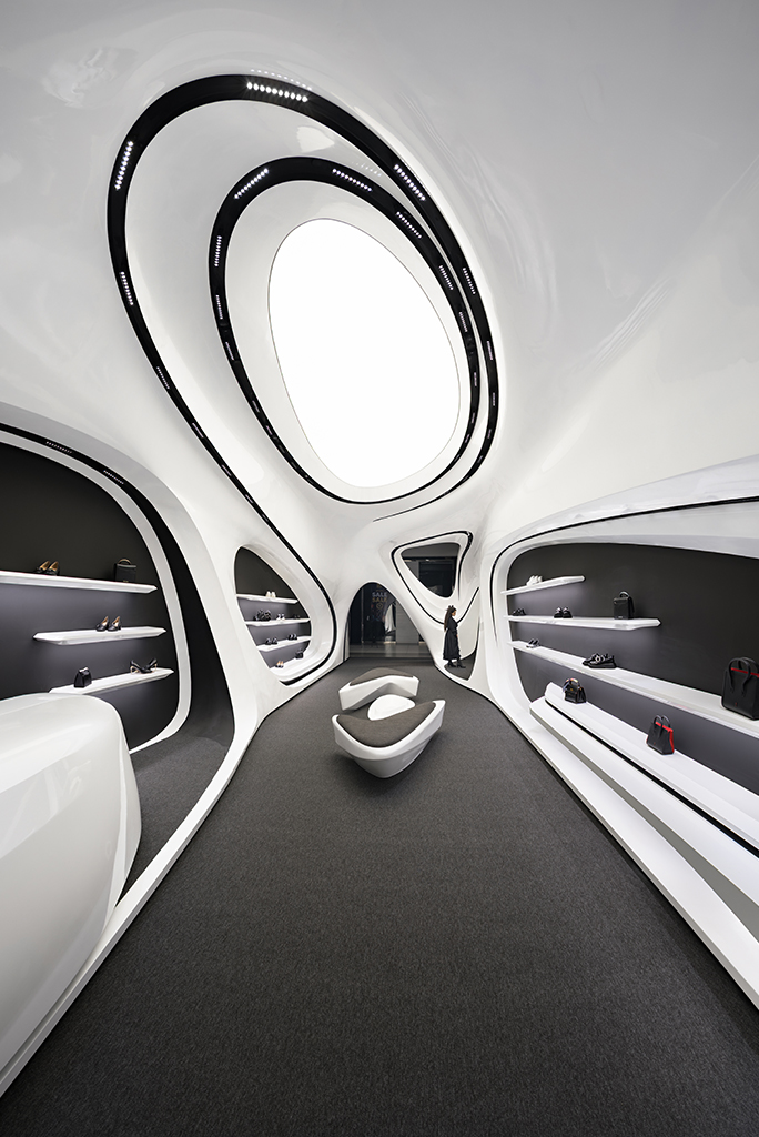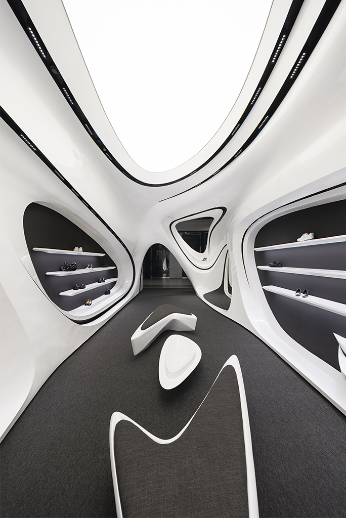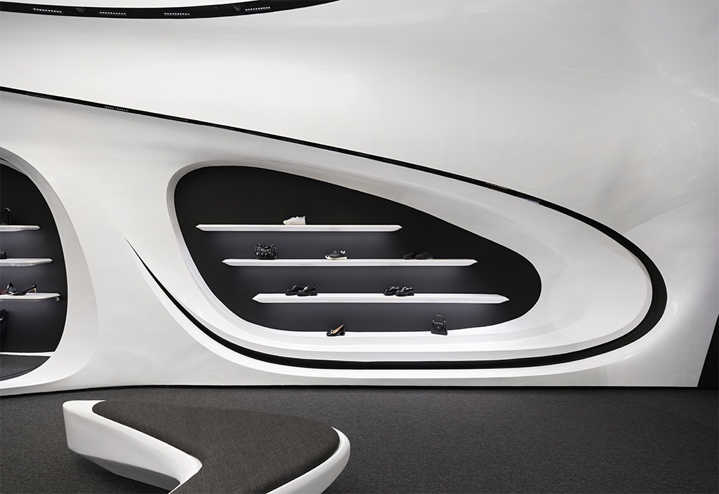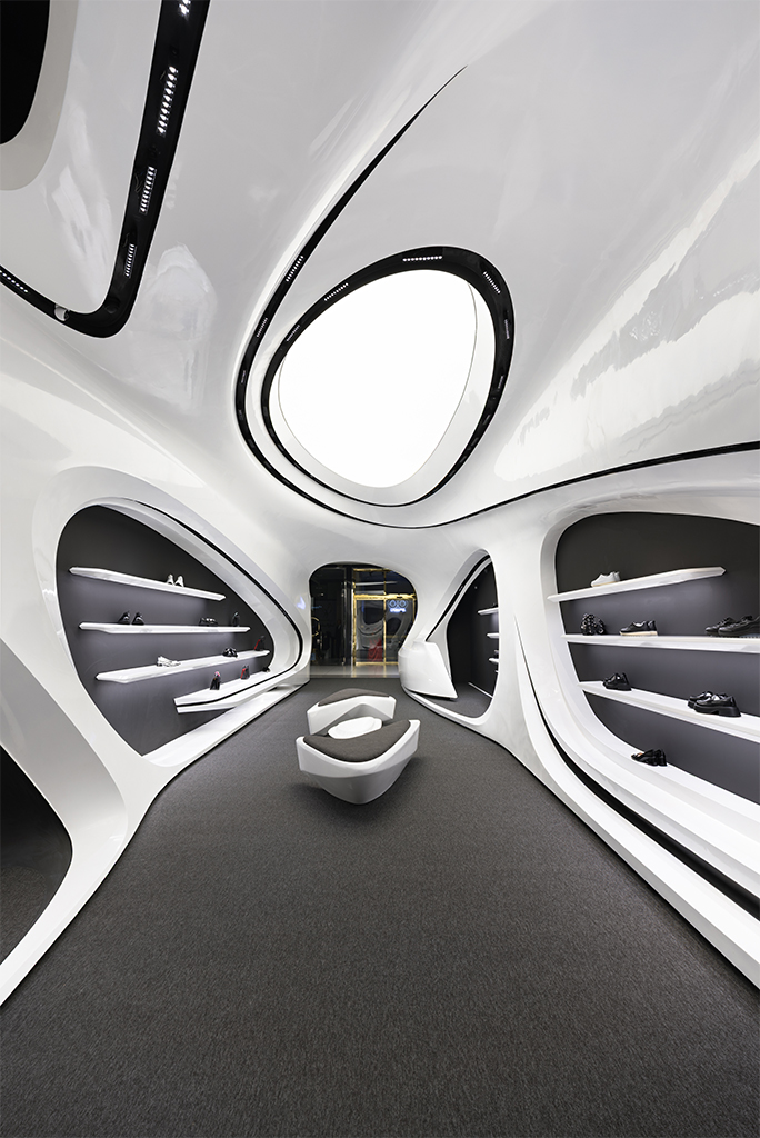 به لطف ارتفاع بلند فضا و آناتومی منعطف فضای فروشگاهی، سازماندهی دوسطحی در فضا شکل گرفت. این نوع برخورد با ارتفاع این امکان را میداد که علاوه بر فضای همکف که به فروش و نمایش محصولات و حضور مخاطبین اختصاص داشت، در بخش بالای سقف نیز فضای مناسبی برای انبارش کالا و آماده سازی برای تحویل به مشتریان ایجاد شود. ایجاد دسترسی به فضای انبار و طراحی شوتینگ کالا که همگن با عناصر بصری طرح باشد از جمله موضوعات چالش برانگیز و از اهداف عملکردی در فرآیند طراحی بود. مبلمان میانی به صورت 360 درجه طراحی شده تا از هر سو قابل استفاده باشند. این مبلمان علاوه بر اهداف عملکردی و ایجاد حس احترام در جهت دادن به فضاهای گردش مشتری نیز نقش بسزایی دارد.