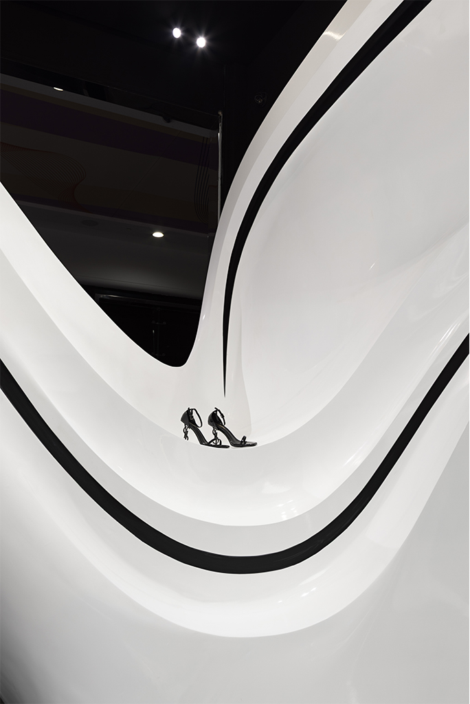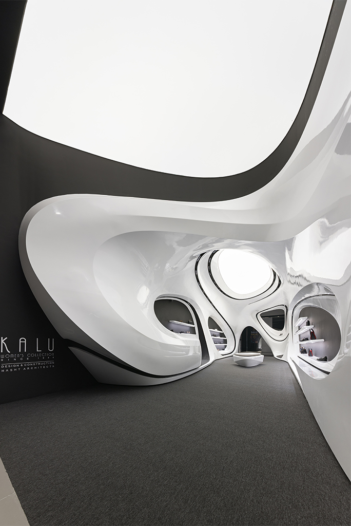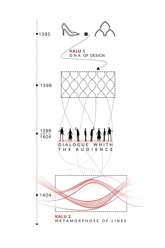 در واقع اگر بپذیریم که در کالو 1 پروژه به عنوان یک بستر و پس زمینه (ظرف) برای نمایش محصول (کیف و کفش زنانه) در قالب یک مقصد ایفای نقش میکند و مخاطب را به خوانش خود فرا میخواند، در کالو 2 اما پروژه با عقب گرد از ژانر رسمی و قامت فروشگاهی رایج و نزدیک شدن به یک میان فضای پاویون گونه در قالب مسیر-مقصد، در لبه تیغ گشتالت حرکت میکند.