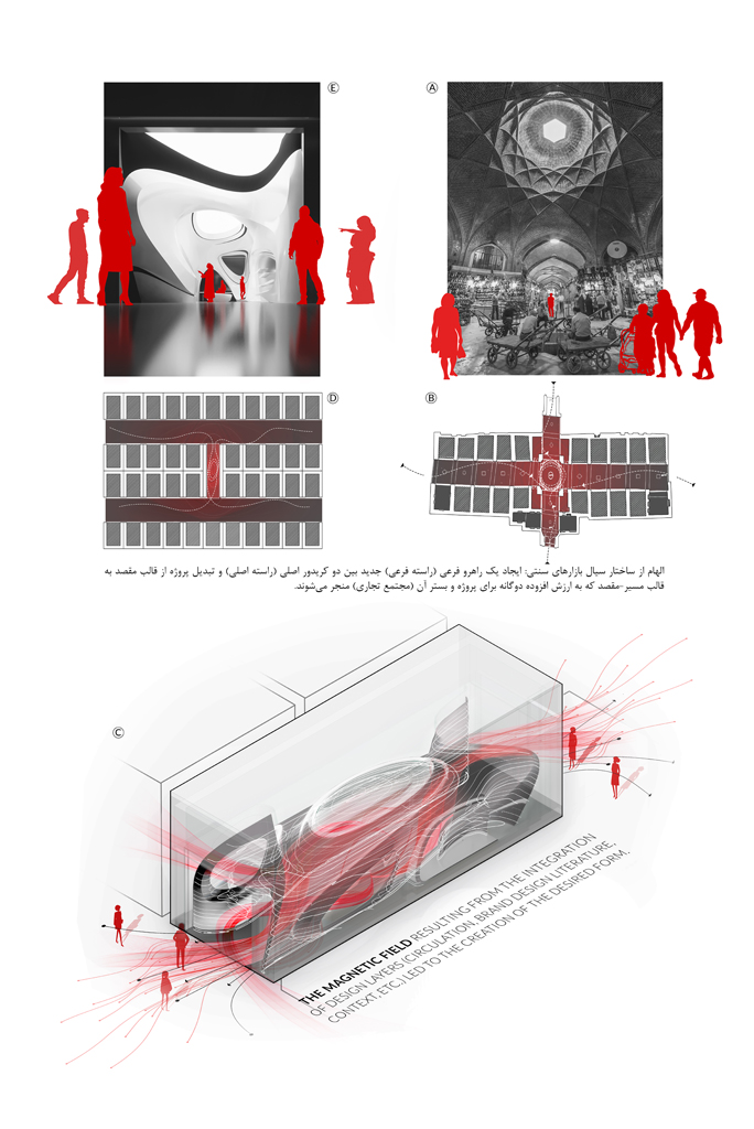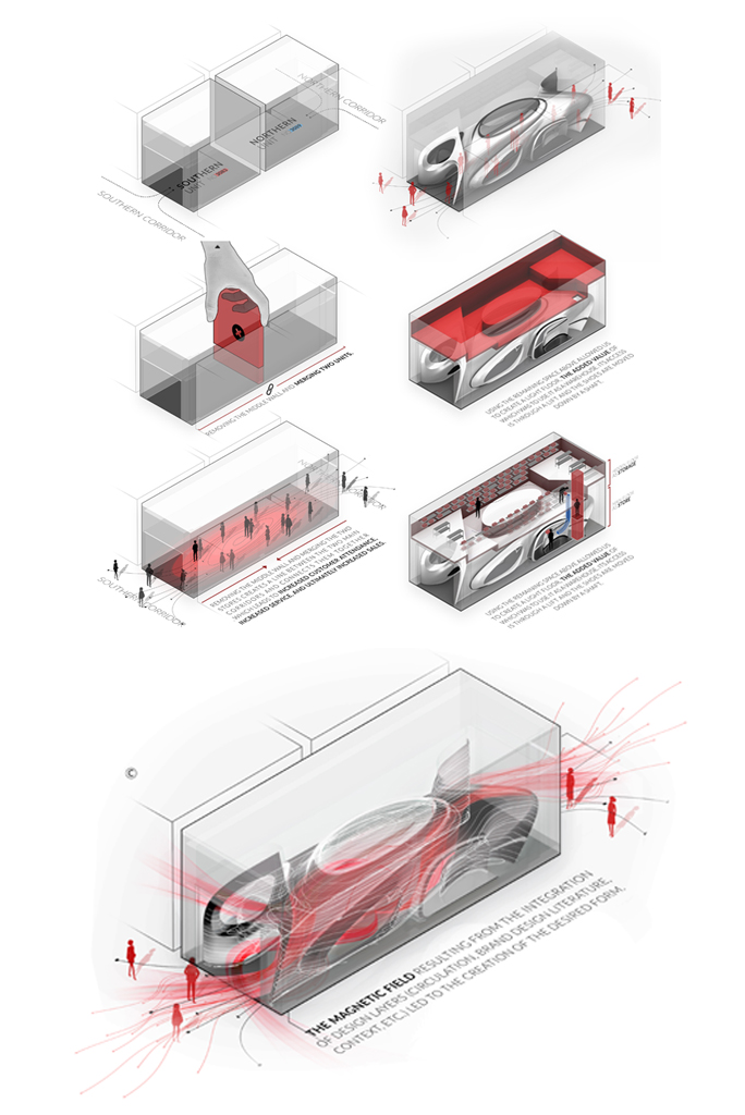 تیم طراحی در جستجوی یافتن راه حلهایی معمارانه بود که بتوان از آن به صورت همزمان در جهت پیوستگی متن و زمینه ، یعنی محصول و فضای زیست آن و نیز تعامل مناسب با بستر (مجتمع تجاری) بهره گرفت. فرآیند طراحی با یک تصمیم اصلی شروع شد و آن حذف دیوار میانی بین دو واحد و تبدیل آن به یک واحد بزرگتر با دسترسی دوسویه بود. پروژه تلاش میکند تا با نگاهی به ساختار سیال بازارهای سنتی با ایجاد یک مسیر(راسته فرعی) جدید بین دو کریدور(راسته اصلی) از مجموعه تجاری دیالوگی جدید با بستر خود ایجاد نماید که سبب ایجاد ارزش افزوده دو سویه برای پروژه و مجموعه باشد. (تبدیل پروژه به کریدور جدید در مجموعه تجاری که به نفع هردوست)