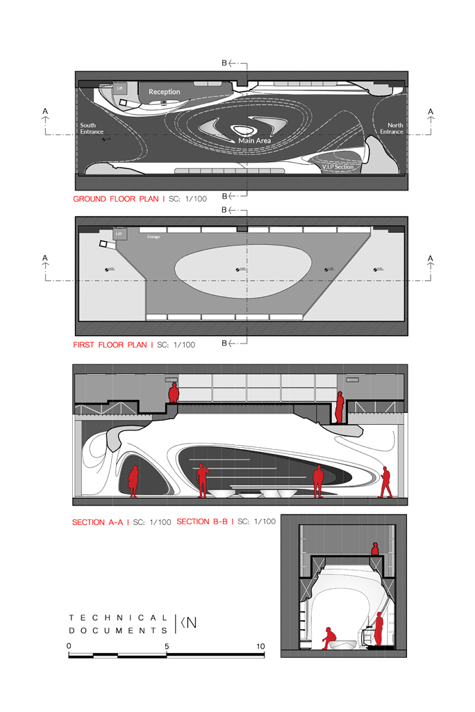 در ادامه سعی شد تا با فعالسازی پلان و مقطع، نوعی میدان جاذبه را تجربه کنیم تا پروژه با جریان حرکت مخاطبین رابطه ای خنثی نداشته باشد. اگر مقادیر متفاوت کیفیتهای فضایی (مانند کم و زیاد شدن دامنه گشودگی، مقیاس، نور و . .) را متناظر با قطبهای آهنربا در نظر بگیریم، پروژه میکوشد با تغییر همزمان در این پارامترها مانند میزان گشایش در پلان و مقطع (برشهای ورودی باریک تر و فضای میانی فراخ تر) و نیز تغییر در مقادیر جرم و فضا و کنش و واکنش آنها، باعث ایجاد قطبهای مثبت و منفی و در نتیجه ایجاد نوعی جاذبه و میدان مغناطیسی بصری و ذهنی بین هر دوگانه (مثبت و منفی) شود که باعث دعوت به حرکت و ایجاد ماجراجویی و کشش مخاطب به میانه و فعالسازی جریان در شریان ایجاد شده میشوند. در واقع پروژه ضمن فعالسازی انرژی در سانتریفیوژ درونی اش به دوگانهای از اجزای سازنده یعنی متن و زمینه تبدیل میشود. موجود زنده ای که حالا با جداسازی از پاکت اصلی و تعلیق در سیتوپلاسم کلی، تجربهای از میان فضای ادامه دار را به مخاطب ارائه میکند. گویی مخاطب به صورت فیزیکی و یا ذهنی مدام در یک میدان مغناطیسی دائمی قرار دارد و نوعی تداوم فضایی یا"فضای ادامه دار" یا "فضای بینهایت" را تجربه می کند. میتوان گفت در ادبیات طراحی فرم در معماری معاصر شاید سطوح ادامهدار(continuous surface) تمرین های فرمی و فیزیکی خوبی باشند اما ایجاد فضای ادامهدار(Continuous Space) دغدغه مهمتر این پروژه هستند که ضمن ارتباط مستقیم با کیفیتهای فضایی و ذهنی، بیشتر با ادراک و احساسات انسانی عجین می شوند.