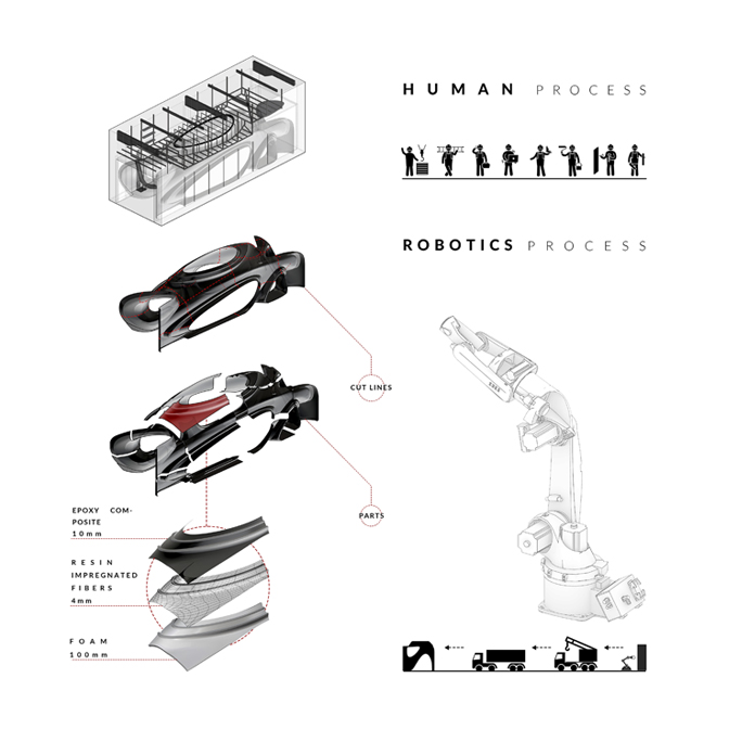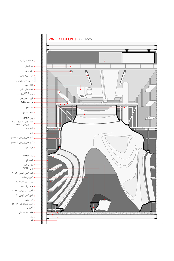 در بخش ساخت دو چالش اصلی پیش روی تیم قرار داشت. اول این که نیاز بود تا از تکنولوژی و متریال هایی استفاده شود که ضمن وفاداری به جزئیات و اهداف طراحی، ماندگاری و دوام مناسبی داشته باشند. دیگر این که با توجه به این که پروژه در مجموعه تجاری فعال قرار داشت، فرآیند بازسازی باید به گونه ای میبود که کمترین تداخل و مزاحمت را برای همسایههای این واحد تجاری داشته باشد. بنابراین با توجه به تجربیات ساخت شعبه قبلی به این نتیجه رسیدیم بار دیگر از تکنولوژی GFRP اما اینبار با تغییر اساسی در ساختار و روش اجرا استفاده کنیم. تغییر ساختاری مرتبط با استفاده از ساندویچ کامپوزیتی با پوسته اپوکسی بود که نسبت به روش قبلی (روش اجرای در محل) اطلاعات بیشتری را با دقت میلیمتر از جزئیات طراحی در اختیار مخاطب قرار میداد. در بخش فرآیند اجرا نیز با نقشه برداری بسیار دقیق و تبدیل طرح به پازلی سه بعدی، فرآیند پیش ساختگی در کارگاه ساخت بیرون از پروژه انجام شد. قطعات در فرآیند دومرحلهای توسط روبات برش خورده و پرداخت شدند. قطعات ساخته شده با شابلونهای پیش بینی شده به هم متصل و قطعات ریز به مدولهای بزرگتری تبدیل و مدولهای جدید در محل پروژه با شاسی مش فلزی از پیش تعیین شده به هم متصل شدند تا هم اتصال مناسب و قابل اعتمادی بین قطعات برقرار شود و هم بخش پاویون مانند به دلیل محافظت از تنشهای سازه ای نیم طبقه بالا (انبار) عمدتا خود ایستا باشد و فقط در بخشهایی محدود به سازه اصلی متصل شود. این روش اما چالشهای پیش بینی نشدهای را نیز در خصوص حمل و نقل قطعات از کارگاه ساخت به محل پروژه و نیز جا به جایی قطعات در پروژه برای اتصال به قطعات قبلی در پیش داشت که به لطف استفاده از شبکه فلزی نگهدارنده و انواع جرثقیل های ماشینی و دستی انجام شد. متریال فرعی گچبرگ بود که در بخشهایی برای پرهیز از هزینههای اضافی در هزینهها مورد استفاده قرار گرفت.